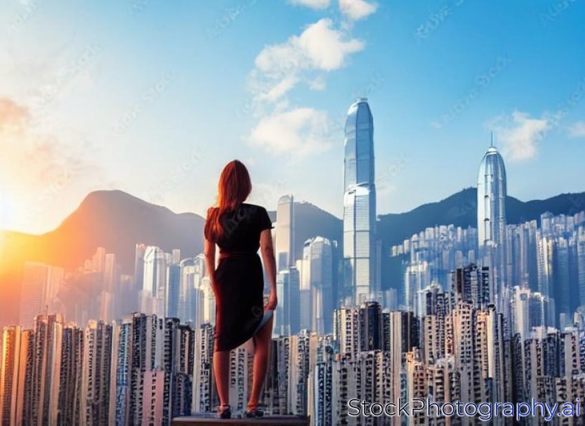 ourist woman on background of a big city with skyscrapers, looking at the sunset in Hong Kong