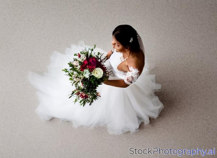 overhead view of bride in traditional dress holding wedding bouquet, isolated on white