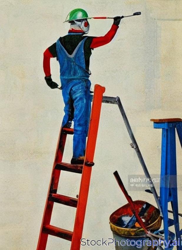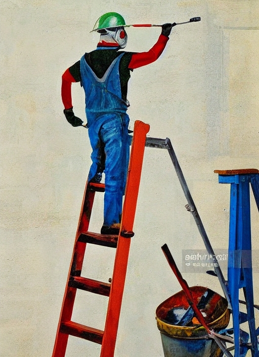 adult blue bottom ceiling color craftsman decorating decoration dirty dungarees gloves helmet home house improvement indoor interior ladder man new paint painter people person portrait profession professional renewal renovate renovating renovation roller room service skill tool view vintage wall white whitewash whitewashing wooden work worker workman-