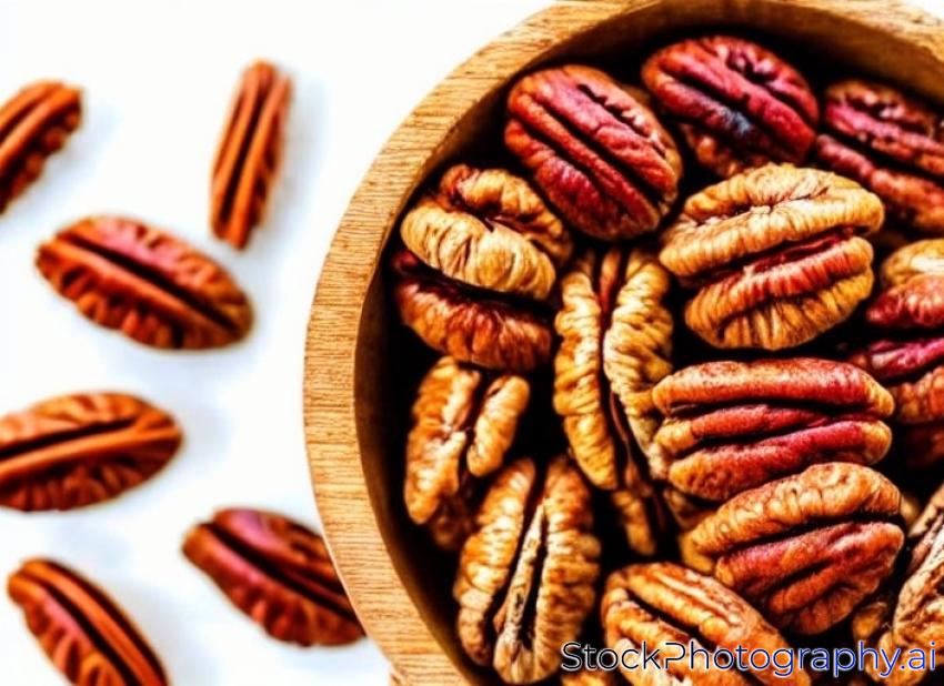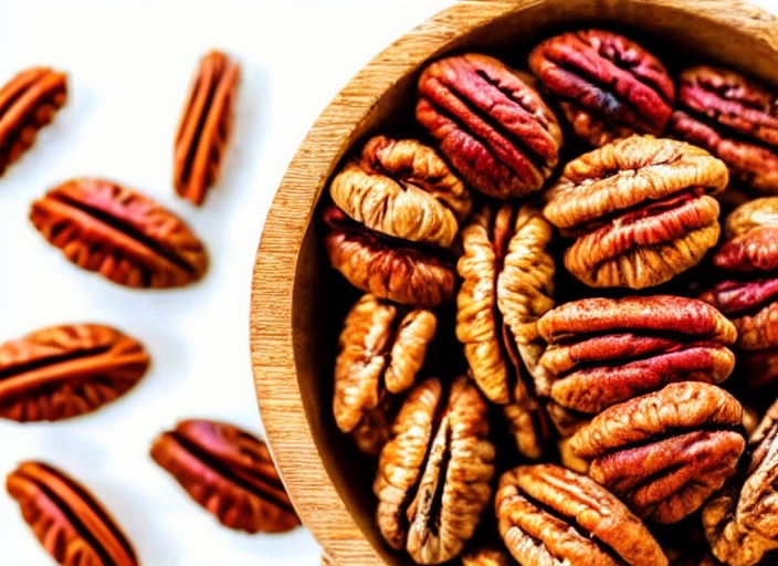 pecan nuts peeled in wooden bowl closeup. vegetarian food isolated on white.