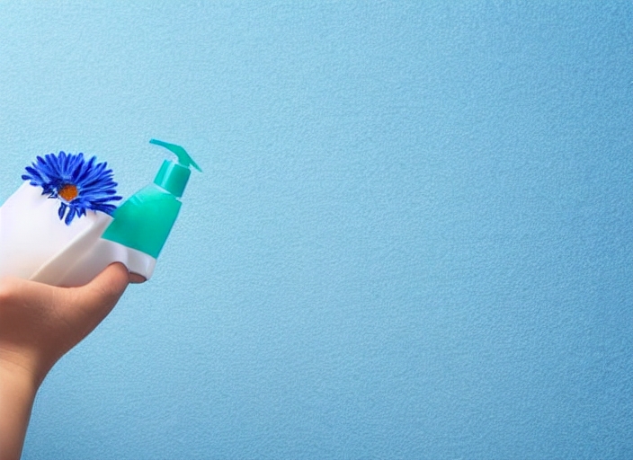 people, housework, purity and housekeeping concept - close up of hand with cleanser spraying over blue background with gerbera flowers