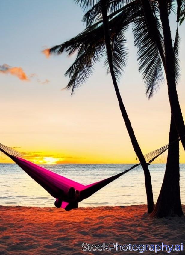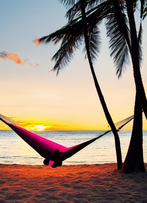 person laying in hammock between two silhouetted palm trees on Hawaiian beach at sunset. Two large palm trees frame hammock with sun setting in distance. Orange, yellow and pink hues