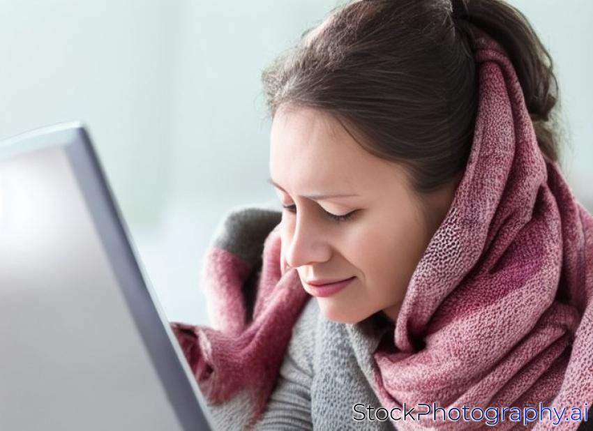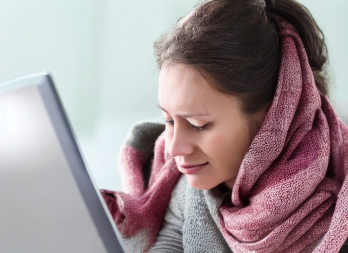 picture of diseased woman in scarf using laptop at home
