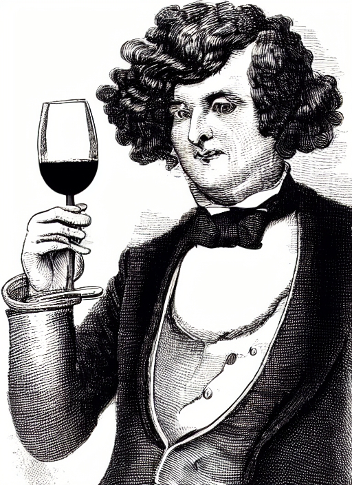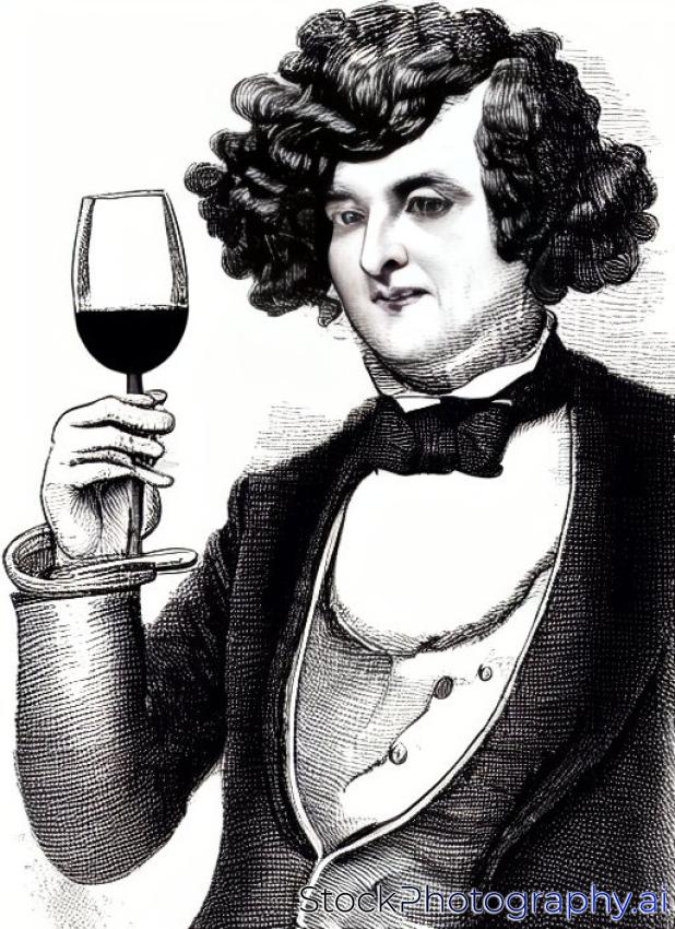pompous victorian man in wig holding wine glass on black