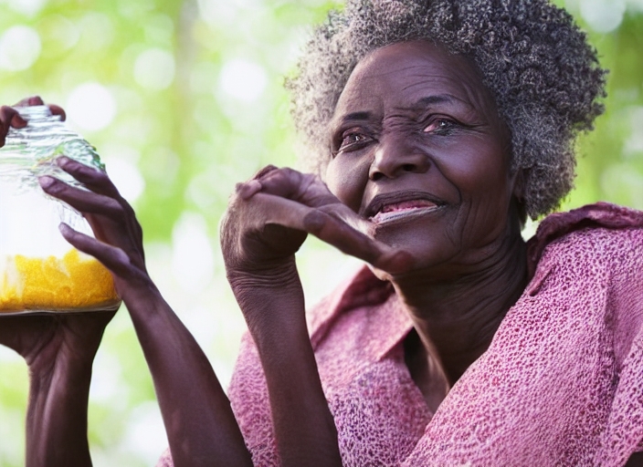 portrait of african aged woman, hands in a plastic container- outdoor concept