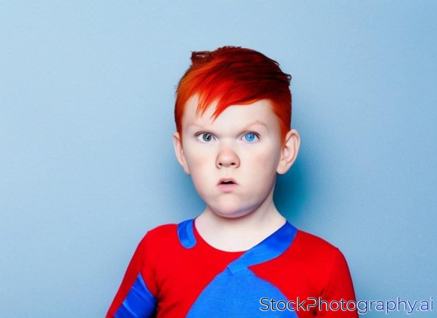 portrait of a boy with a frustrated face and frowning eyebrows, todler with red hair and a blue bodysuit isolated on a white background.