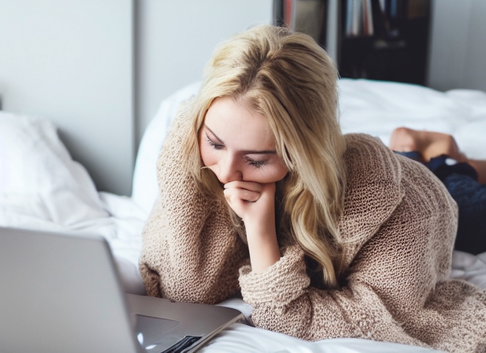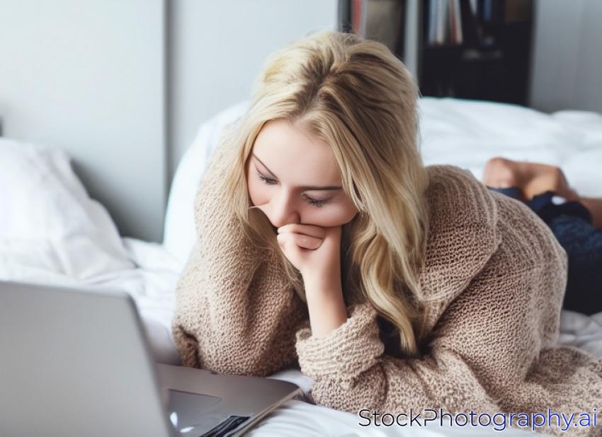 portrait of a girl behind a laptop screen. Beautiful blonde woman lying on the bed and looks at the laptop screen. Blogging, browsing internet, chatting. In a warm cozy sweater