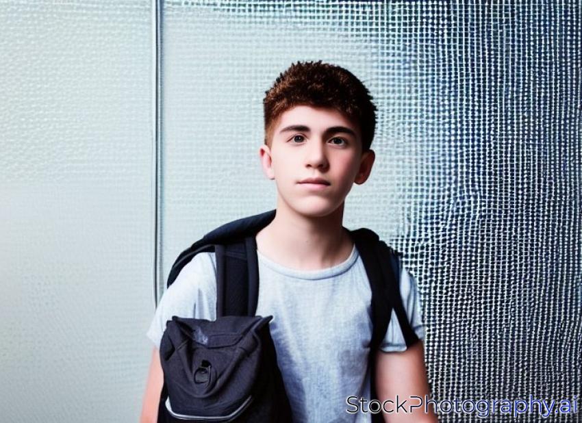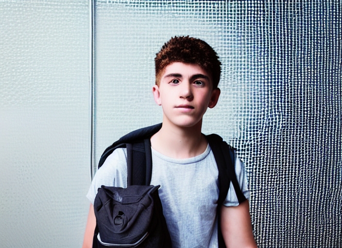 portrait of a teenager boy with rucksack and extreme light in front of a metal grid pattern