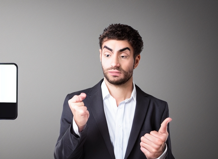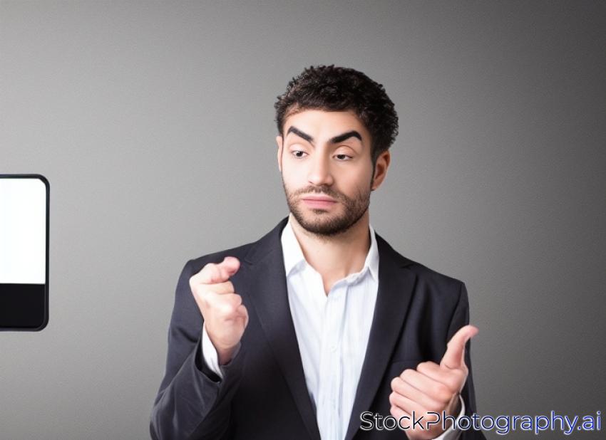 portrait of a young business man standing against a black background and selecting something from an imaginary screen with his finger while looking at it very focused