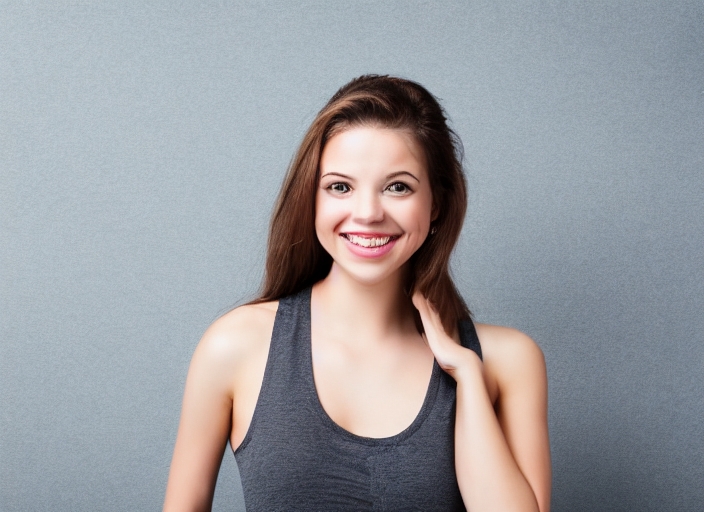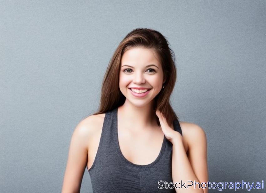 portrait of beautiful smiling young woman in black tank top clothing, on bright grey background, with blank copyspace area for slogan or text