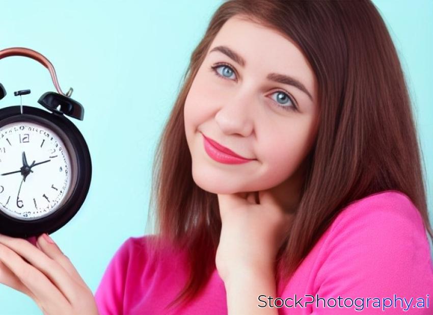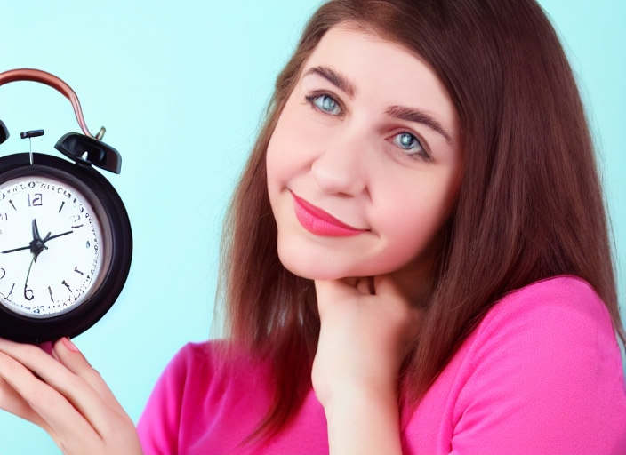 portrait of beautiful young woman with a red alarm clock standing on the pink background