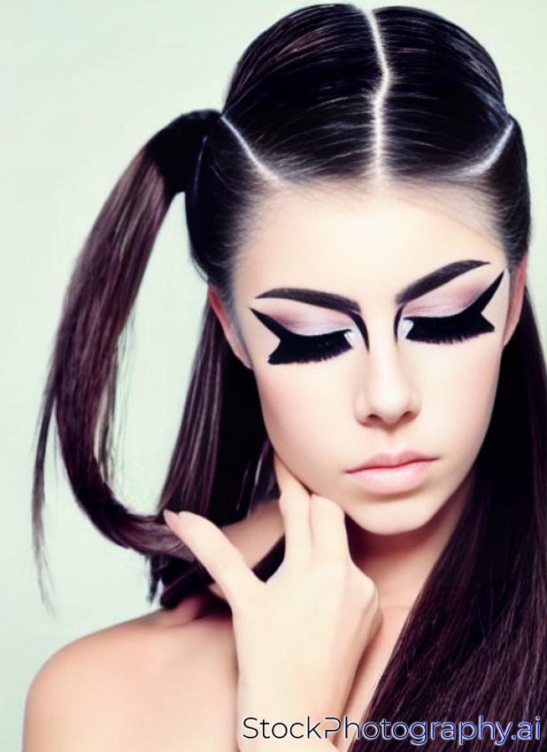 portrait of pretty and sensual brunette with hair pony tail and creative make up with long eyelashes posing