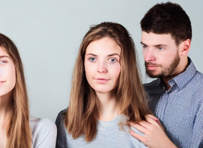 portrait of young caucasian couple on gray. portrait of young caucasian couple on gray. girl is telling something on man's ear and he is looking dissapointed