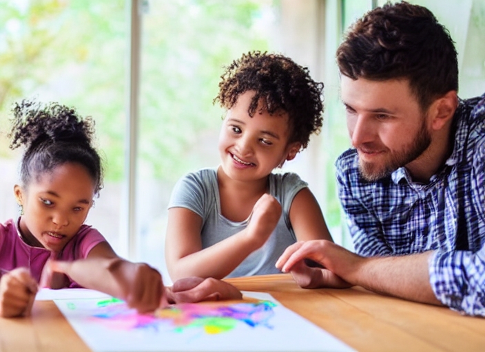 positive young dad explaining while drawing together with small daughter using pencils sitting indoors