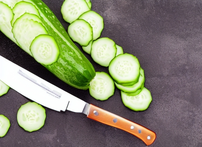 pregnant woman with knife on kitchen cuts cucumber