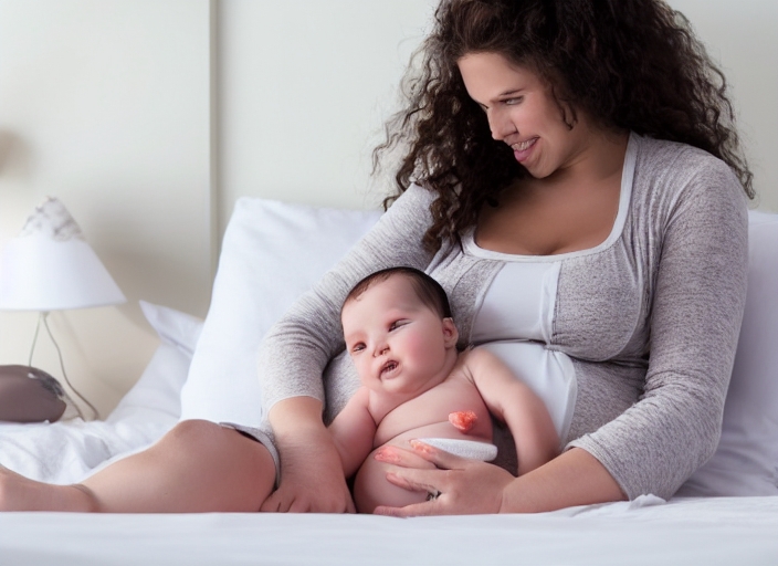 pregnant woman with ultrasound image of baby sitting on bed in the bedroom at home
