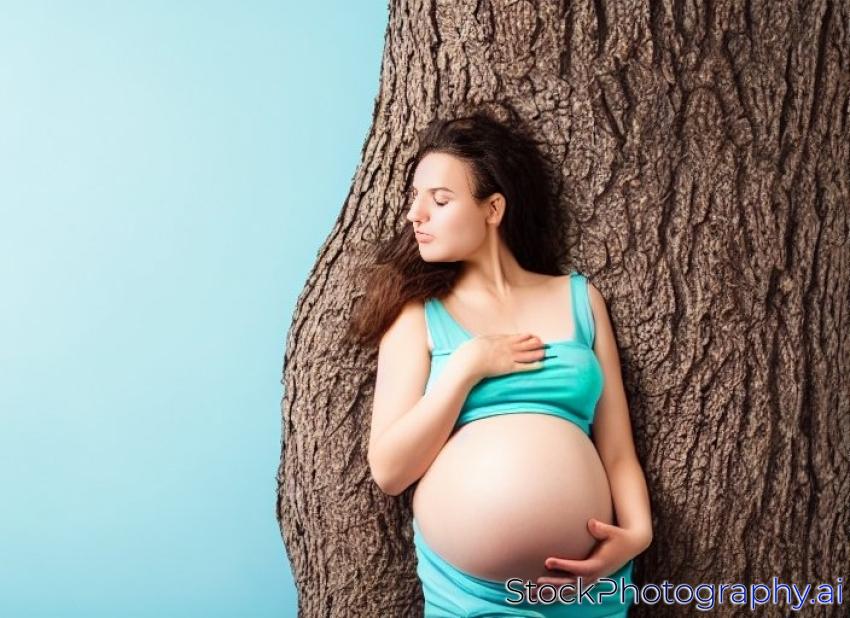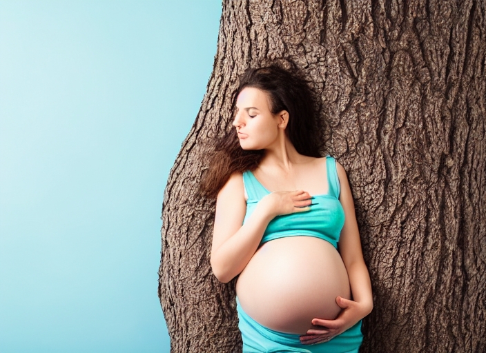 pregnant woman's belly on a colored background, arms around himself, near a tree with toys owls