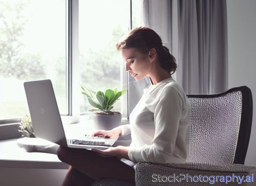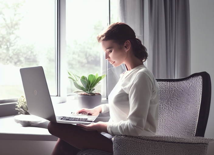 pretty woman with laptop sitting in chair in morning sunlight and typing
