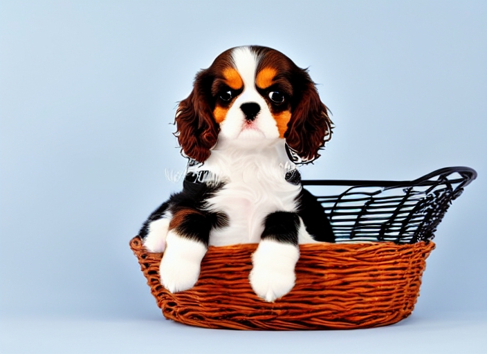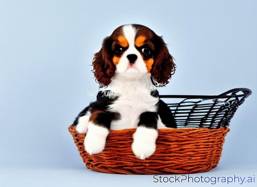 puppy - cavalier king charles spaniel puppy sitting in a basket isolated on white background - 7 weeks old