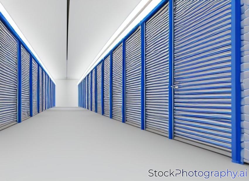 rental storage room. Identical doors to storage rooms. Three-dimensional interior of warehouse company. Storage Units rental company. Homogeneous warehouse container along wall. 3d image.