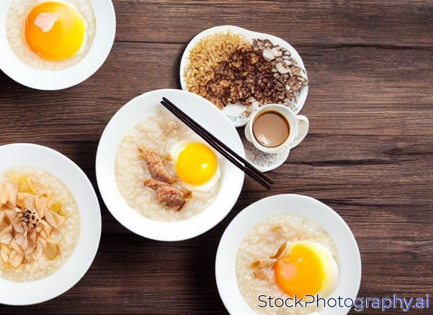 rice porridge, rice gruel or congee with pork, egg, sliced ginger and vegetable, delicious the traditional Chinese breakfast on wooden table and hot coffee