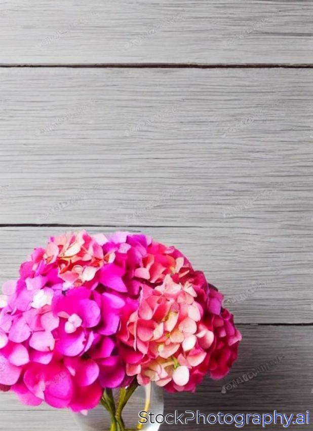 romantic mood. beautiful bright pink hydrangea flowers in a vase of glass on a light wooden background, one flower lezhin separately