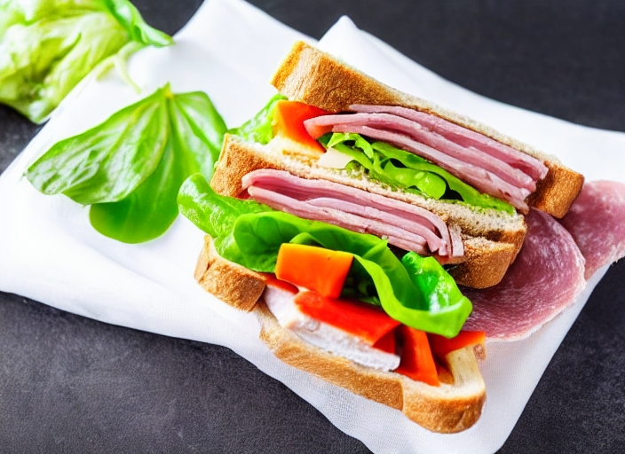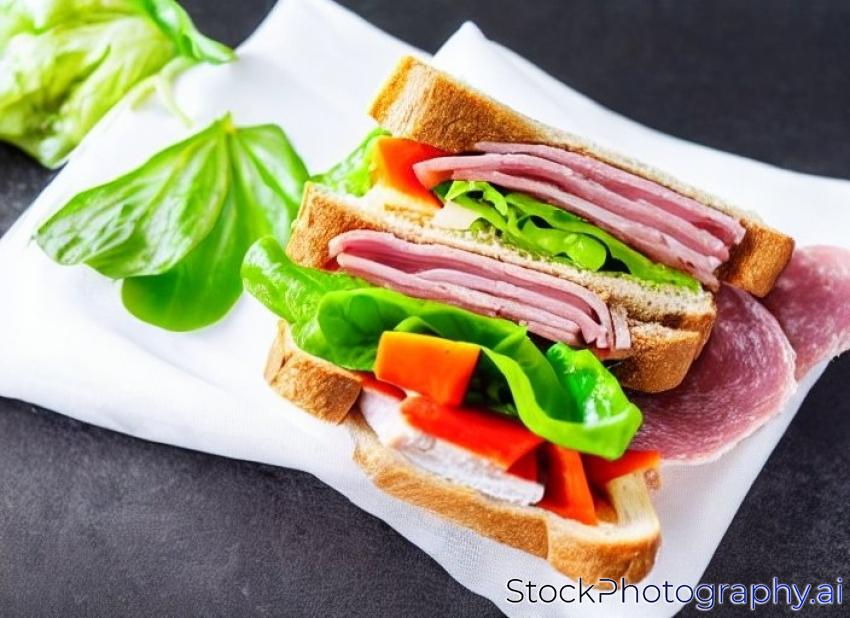 sandwich with ham and fresh vegetables, wrapped in white napkin, on black dish