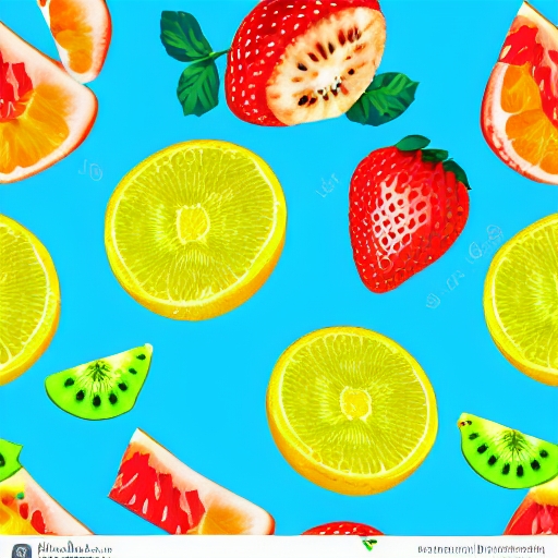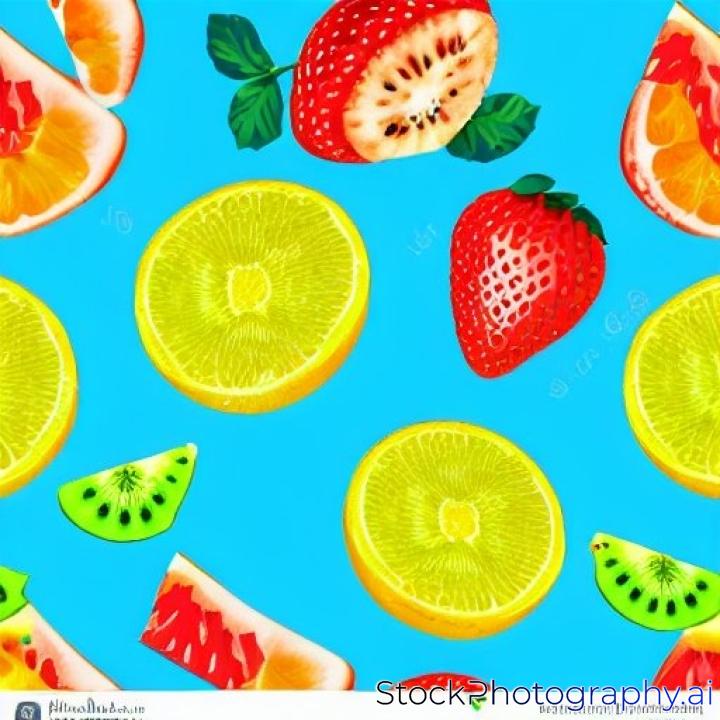 seamless pattern with citrus, strawberry and kiwi slices. On blue background. Food design for wrapping paper, textile.