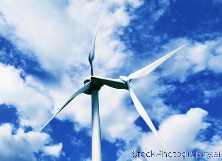 single wind turbine low angle against blue sky with clouds