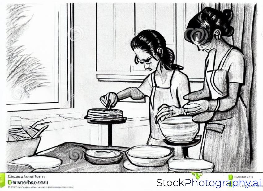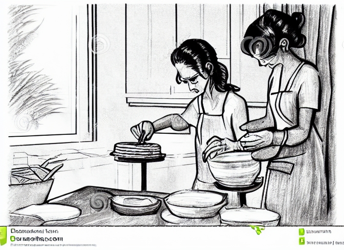 sketch illustration with woman making cake. black and white hand drawn sketch of housewife