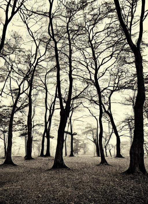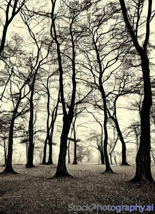 spooky forest with trees with twisted branches sepia
