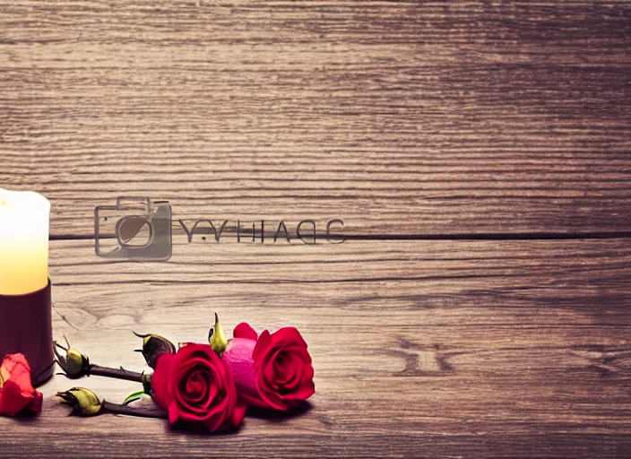 still life with candle and rose flower on wooden table over grunge background, Valentine concept.