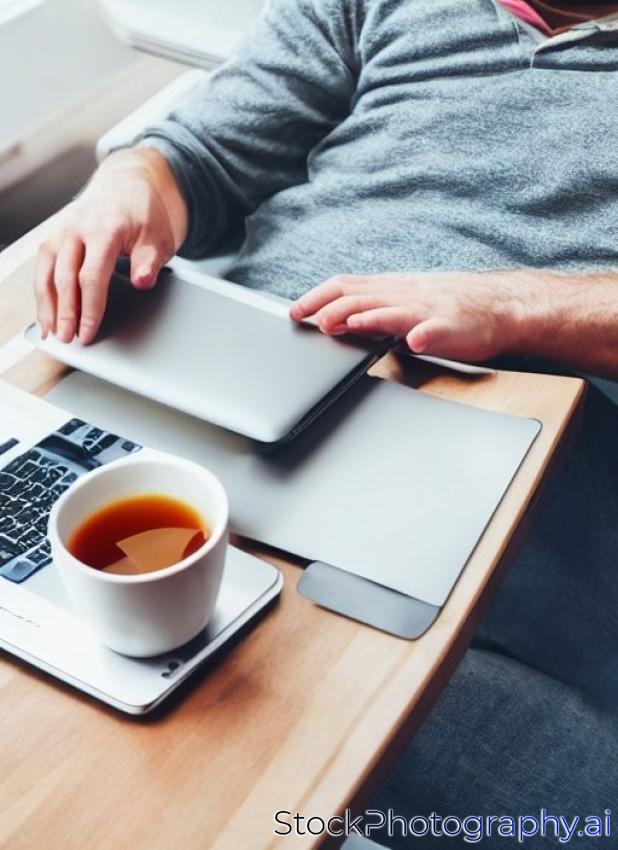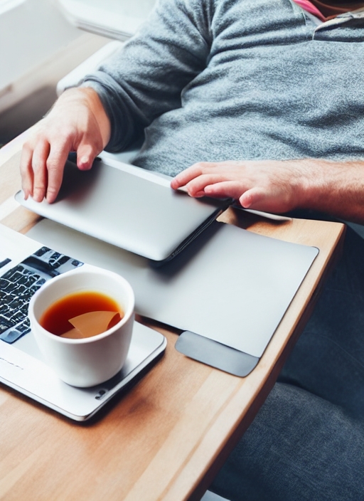 technology, drinks and lifestyle concept - man working with laptop at home, holding a cup of warm tea or coffee