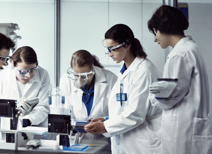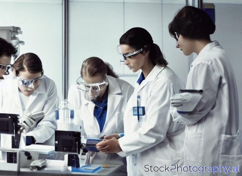 thre female researchers carrying out research in a chemistry lab (color toned image; shallow DOF)