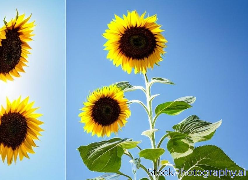 two sunflowers seen from bottom up to the sky