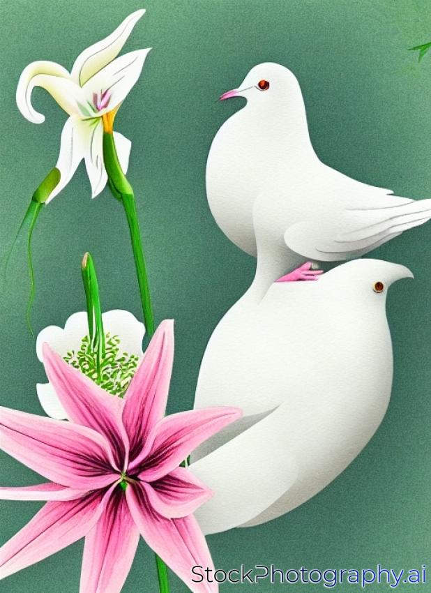 two white doves and a lily flower