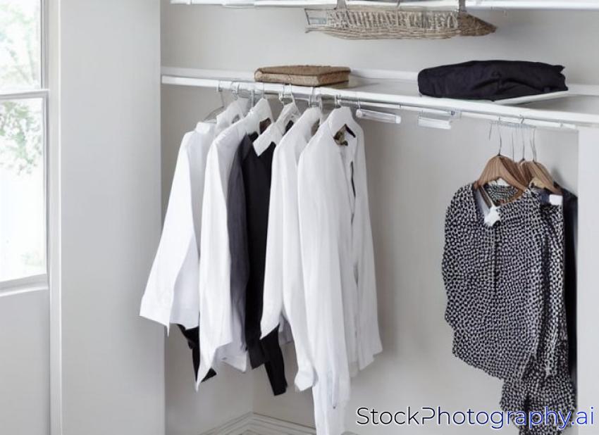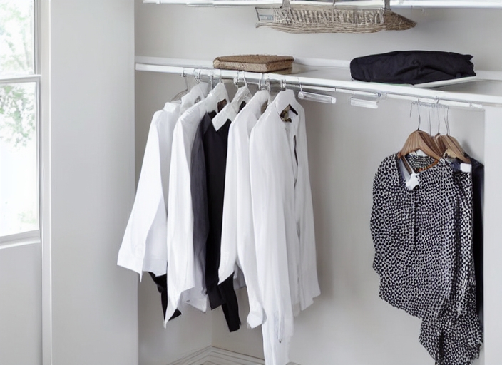 white shirts hanging on white built-in cloths racks, with drawers and other accessories