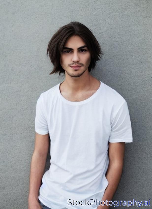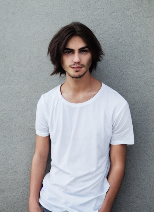 young man long hair in white t-shirt portrait